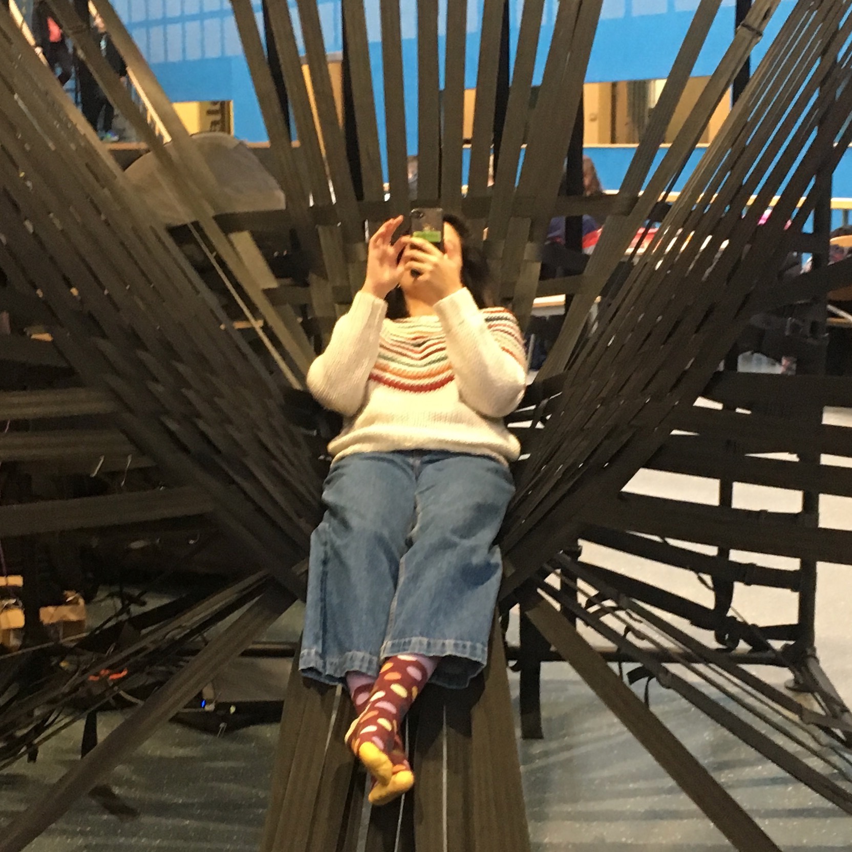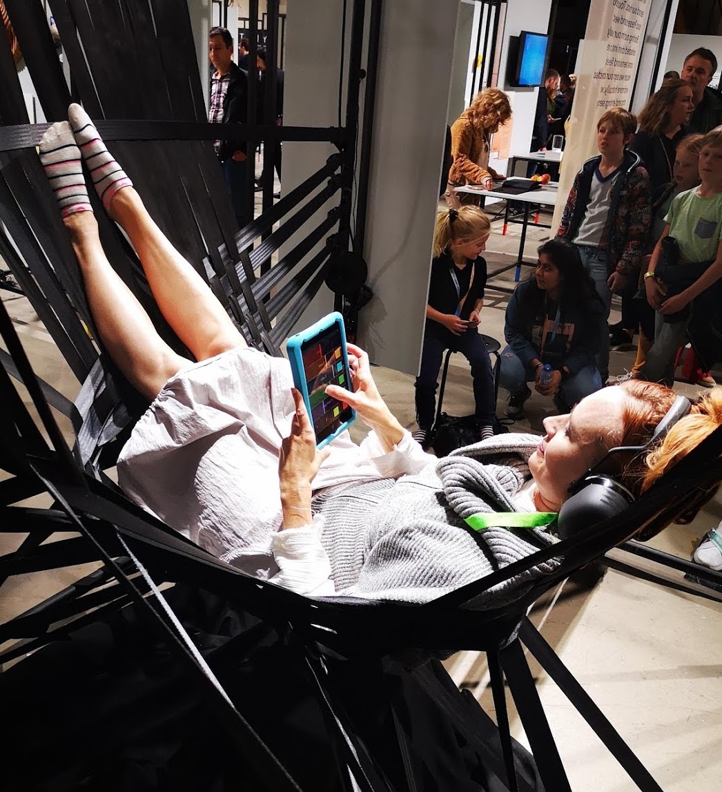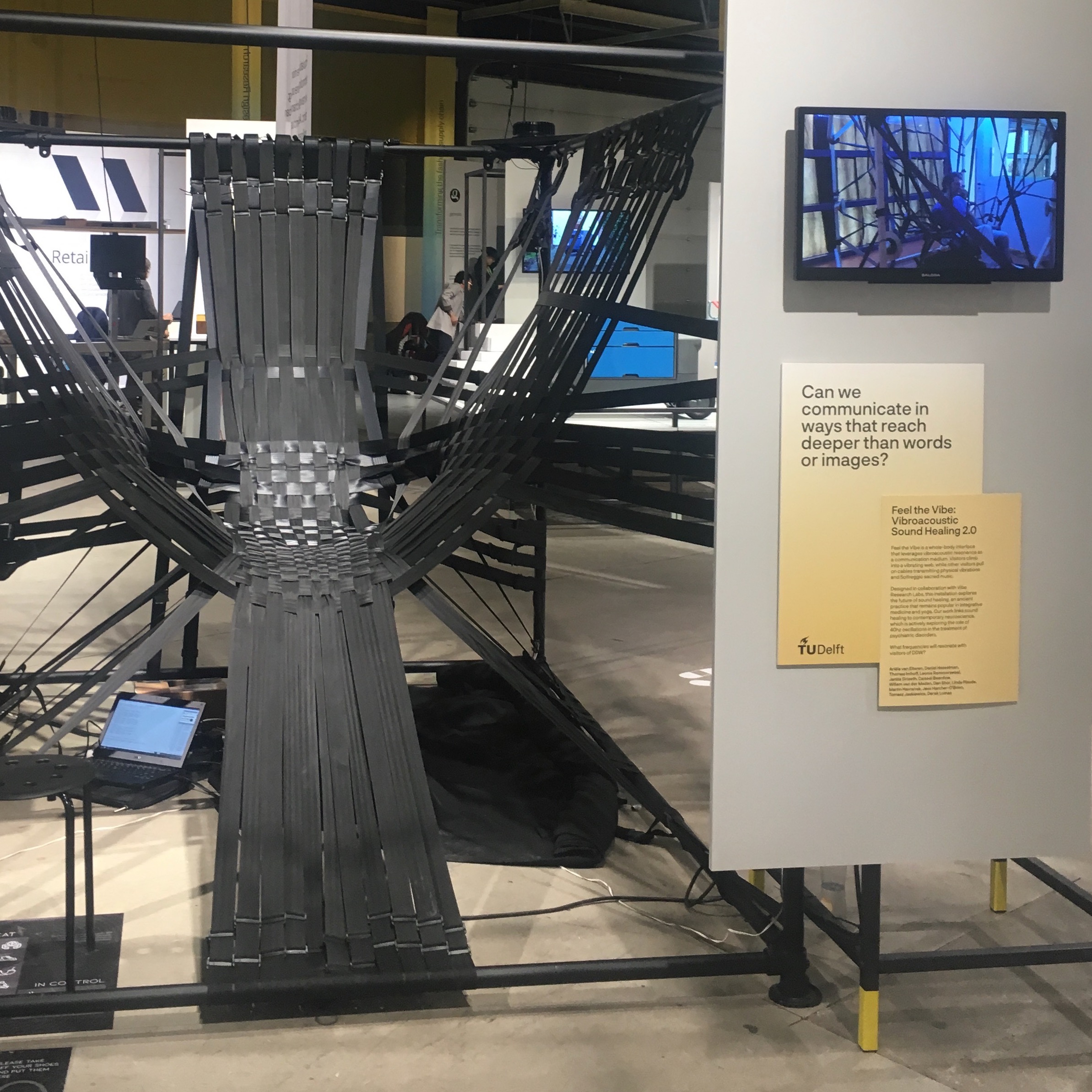 The installation concept draws upon fundamental physics and makes it tangible through an immersive, personalised haptic experience. A woven hammock structure envelops visitors and propagates vibrations from tactile speakers attached to a supporting frame. The vibrations are composed of multiple distinct frequencies, which can be altered and mixed by visitors with a purpose-built app connected to the motors' control software.